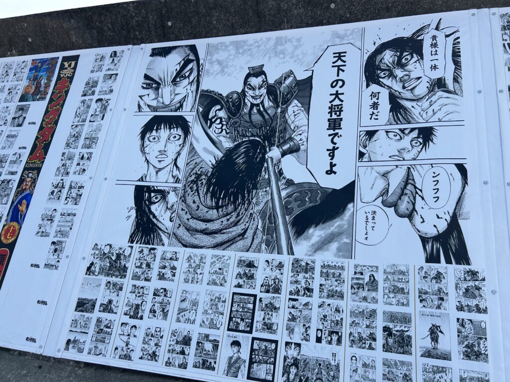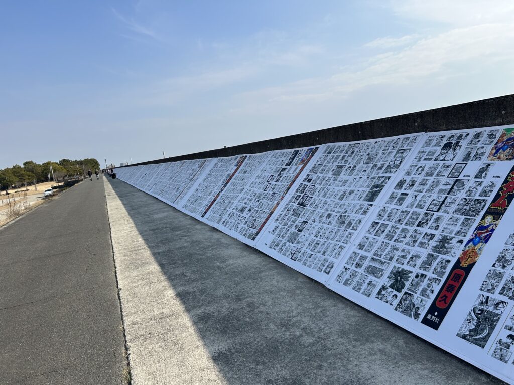 現在佐賀空港はキングダム空港として注目されてますが、東与賀にある干潟公園でもキングダム連載20周年を記念して、防波堤一面に漫画のラッピングが施されており、1巻~77巻までが読めるようになっております。