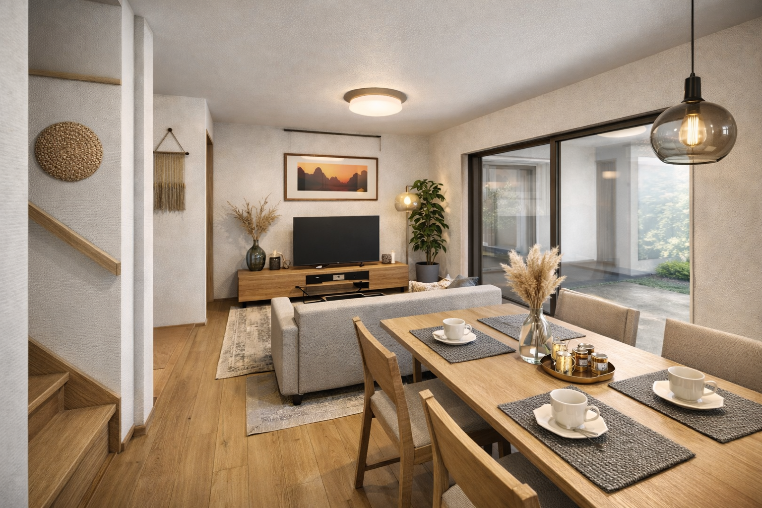 大開口からたっぷりと光が差し込むリビングは、朝のひかりも夜の落ち着きも、どちらも楽しめる場所。