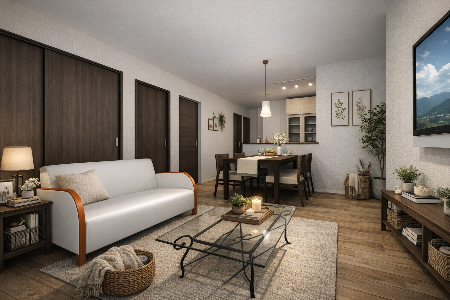 18.3帖のLDKは、キッチンから全体を見渡せる配置。
