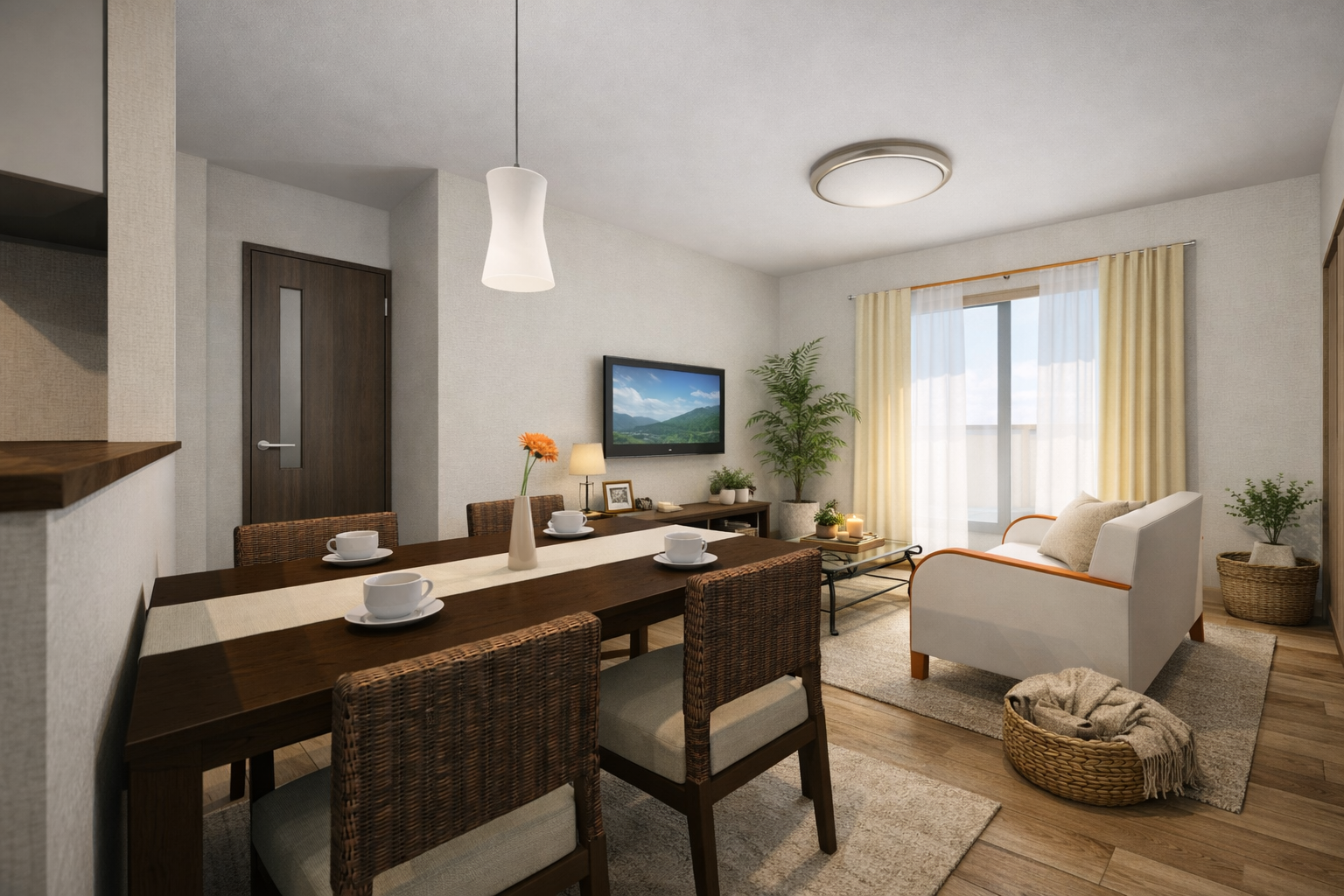 南側からやわらかな光が入り、ダイニングからリビングまで明るさが広がります。