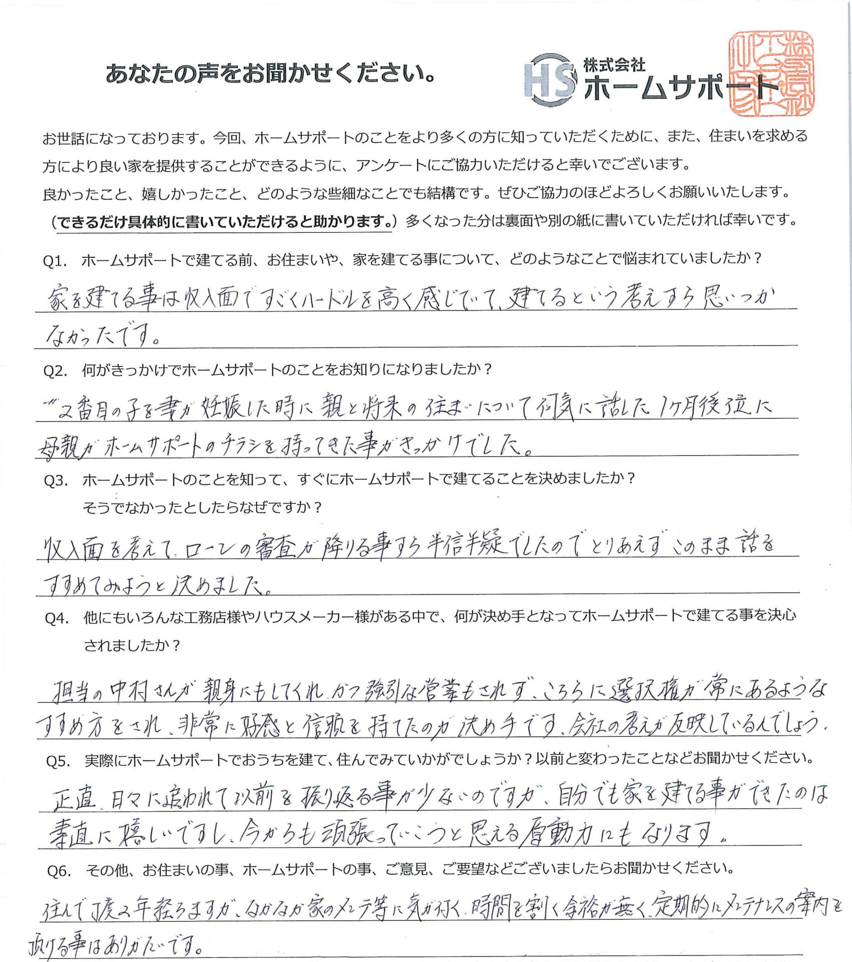 2番目の子を妻が妊娠した時に親と将来の住まいについて何気に話した1ヶ月後位に母親がホームサポートのチラシを持ってきたことがきっかけでした。