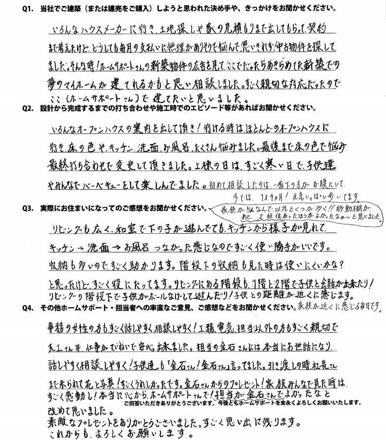 担当営業さんには本当にお世話になり、話しやすく、相談しやすく!子供たちも「金石さん、金石さん」と言ってました。