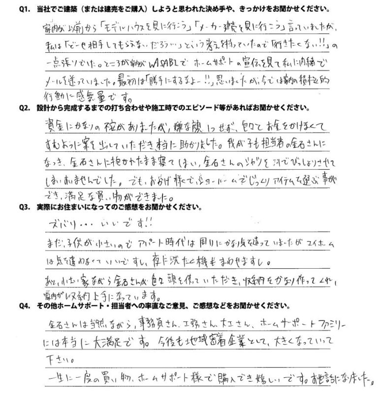 金石さんは当然ながら、事務員さん、工務さん、大工さん、ホームサポートファミリーには本当に大満足です。