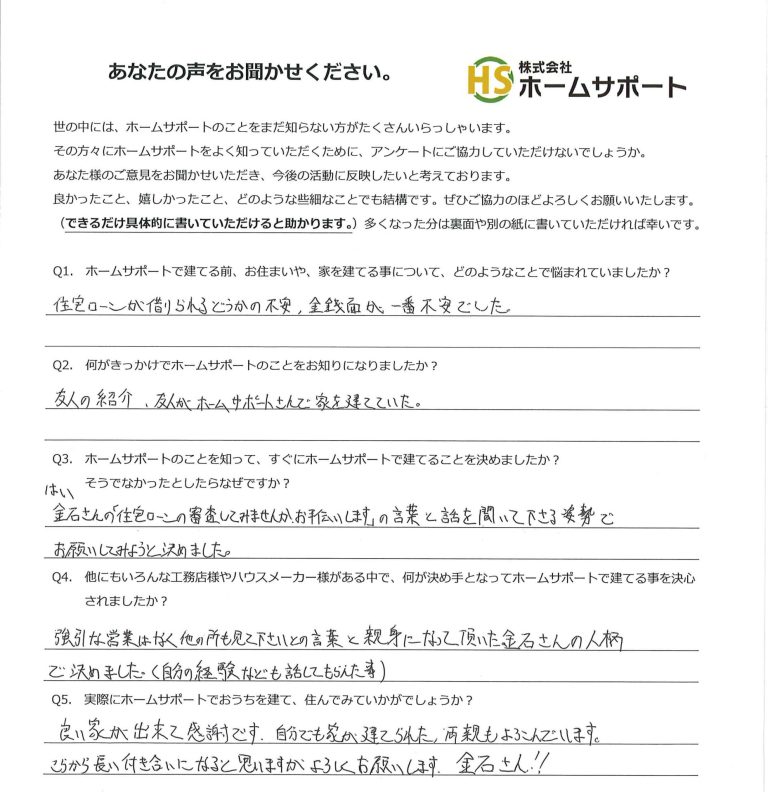 強引な営業はなく、他のところも見てくださいとの言葉と、親身になって頂いた金石さんの人柄で決めました。(自分の経験なども話してもらえた事)