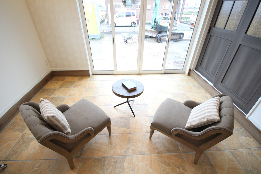 約7帖のカフェスペースは土足のままでも動けて外にも簡単に行き来ができます。