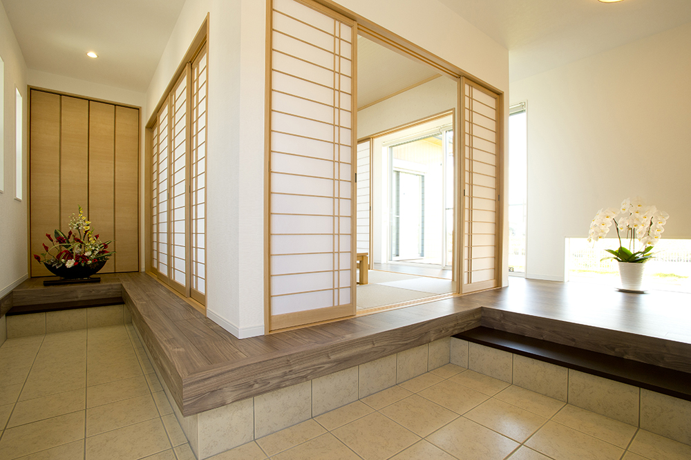玄関には離れを思わせる掘りごたつ付きの和室スペースと、外の光を取り込む窓がやさしく出迎えてくれます。